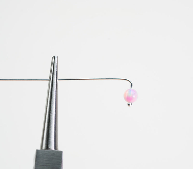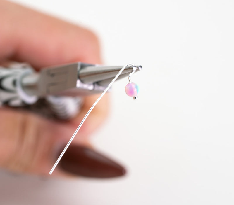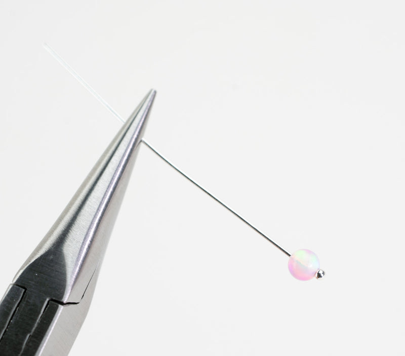 Hold the headpin at the bend using round-nose pliers, positioning the pliers vertically so one side of the pliers is above the wire and the other is below it.